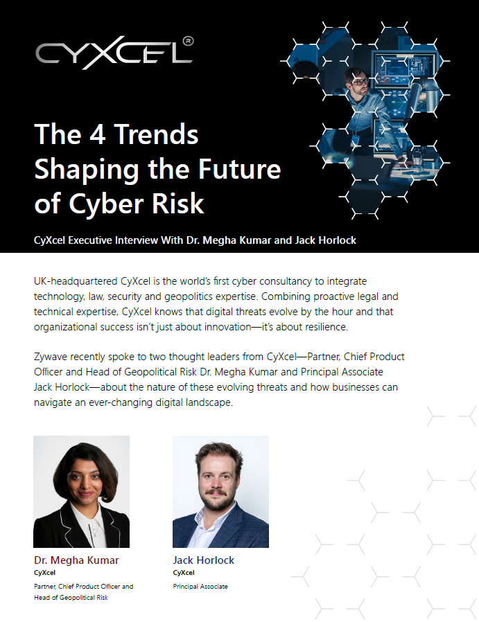 In this exclusive CyXcel executive interview, two leading experts in the field, Dr. Megha Kumar, Partner, Chief Product Officer, and Head of Geopolitical Risk, and Jack Horlock, Principal Associate, share their invaluable insights into the future of cyber risk. Their conversation will offer you a better understanding of the evolving cyber threats and provide insight into how businesses can navigate the ever-changing digital landscape.