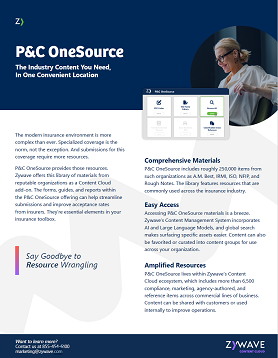 P&C OneSource is housed in a CMS featuring 6,500 commercial lines content assets. This arrangement makes it easy to access compliance, marketing, and agency-authored materials in addition to P&C OneSource assets.