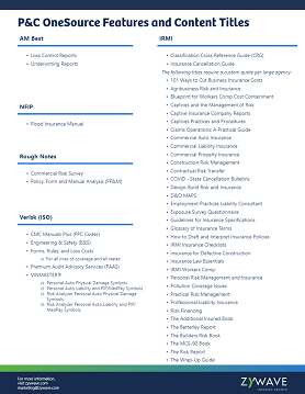 P&C OneSource includes more than 250,000 items from reputable industry organizations. Resources include forms, guides and reports that are heavily utilized in insurance workflows.